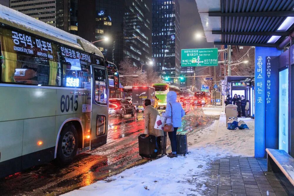 2025年12月4日,在韩国首尔,人们在雪中候车。新华社发(朴晋泽摄)