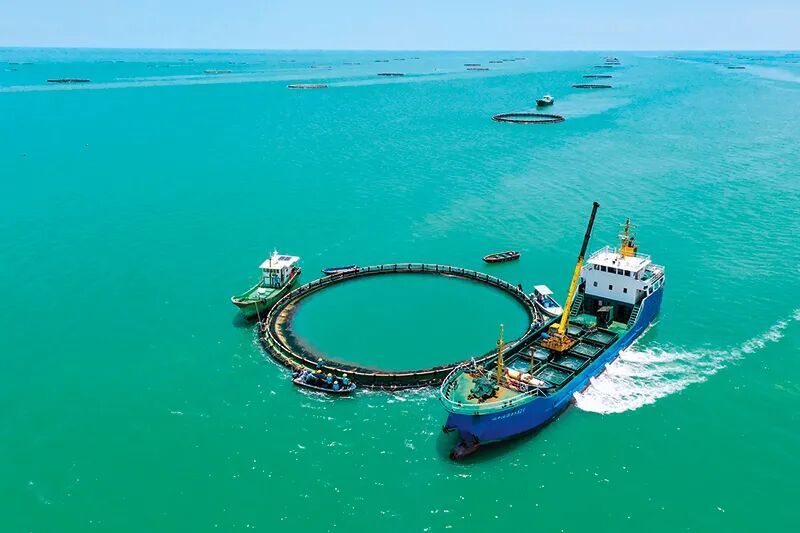 在广东省湛江市徐闻县西连镇,徐闻国桥深海养殖有限公司的金鲳鱼深海网箱整齐排列。(新华社/图)